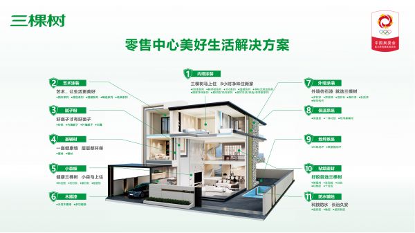 在这一解决方案中,三棵树的产品涵盖了乳胶漆、仿石漆、艺术漆、胶黏剂、防水涂料、基辅材、小森板等不同细分品类,能为消费者带来内墙精装、外墙涂装、基层处理、家装防水等一系列全屋整体家居美装服务,以兼顾健康环保与空间美学的产品,为消费者塑造向往美家。