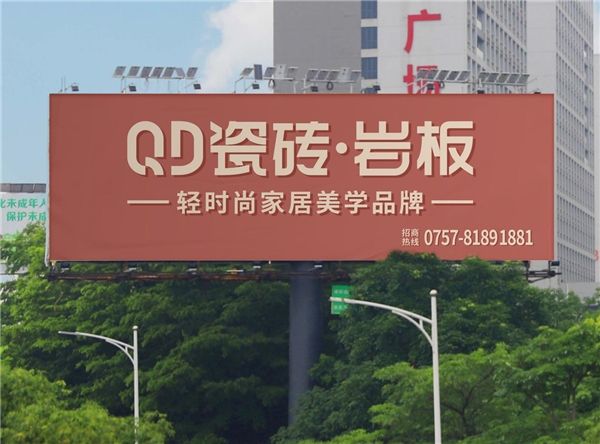 新架势、新形象、新姿态!QD瓷砖重金投入高炮宣传,以“轻时尚家居美学品牌”新名片,配以品牌全新VI主色调,全新广告画化身主干道风景,密集投放中国陶都多个核心路段。