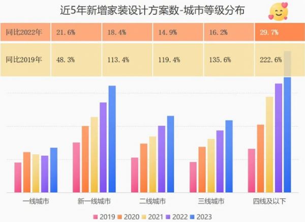 以家装设计为例,相对一二线城市,人口庞大的四线及以下城市市场仍留有不少空白。家装设计服务加速下沉,四线及以下城市新增家装设计方案领涨,同比2019年涨幅达222.6%。