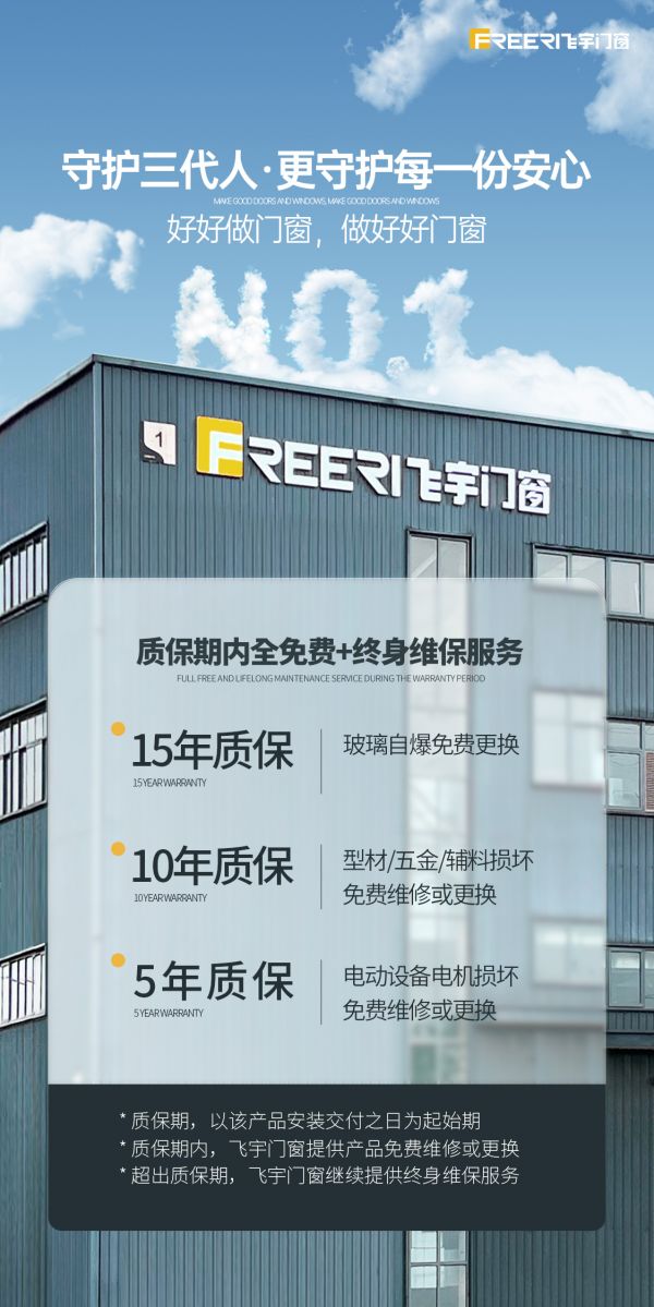 交付不是服务的结束,而是服务的开始,我们承诺,自交付之日起,我们仍将继续为飞宇产品提供最高15年免费质保服务,让门窗能够更长久稳定守护家居生活。