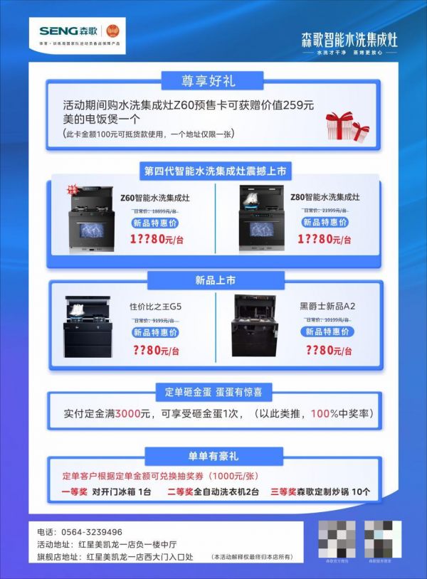 燃情 4月,森歌蒸烤节比五一抢购优先一步,比618优惠更多一重,携同张雨霏冠军同款集成灶森歌鲸洗小灶Z60,联动六安、福州、淄博、郑州、张家港、长沙、贵阳、昆明八城打造专场活动,乒乓球奥运冠军、森歌品牌形象代言人许听也将亲临六安站现场,带来一系列与智能水洗集成灶的趣味互动~