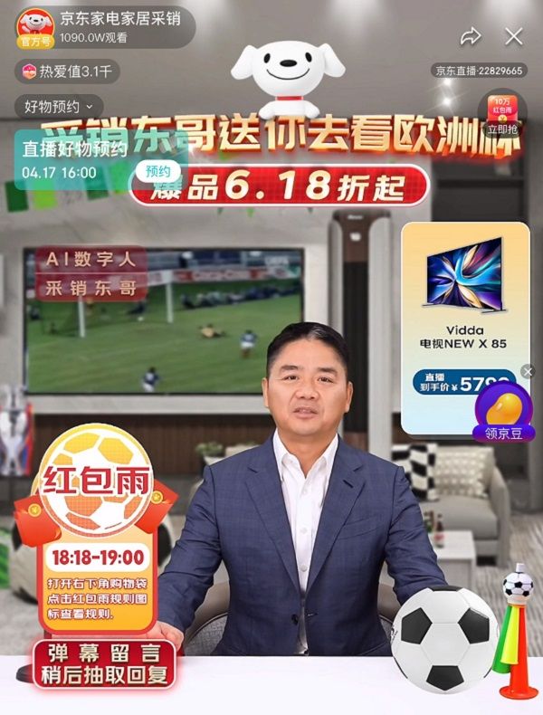 刘强东AI数字人首播战报:家电家居直播间观看量超1200万