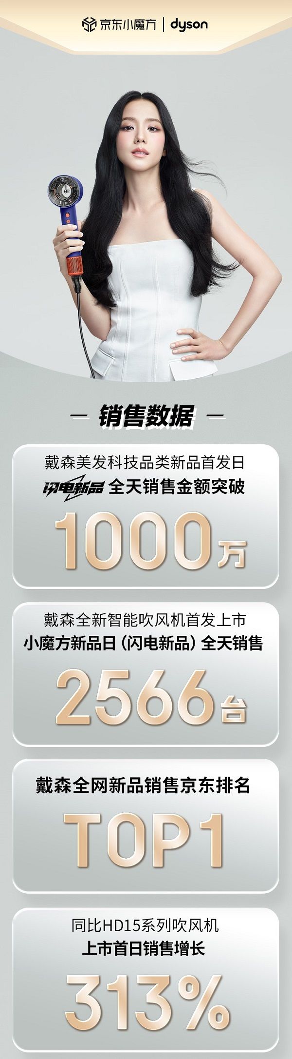 4月12日,戴森HD16智能吹风机京东小魔方新品日首发活动完美收官。本次戴森新品全网同步发售,京东销量位居全网首位。从4月8日首发至4月12日收官,闪电新品戴森HD16智能吹风机销量突破2566台,戴森电吹风品牌成交金额达1002万,是近30天日销的5.79倍。此外,4月8日首发当天,戴森新品、戴森品牌成交金额均位列品类TOP1,同比HD15系列吹风机上市首日销售增长313%!