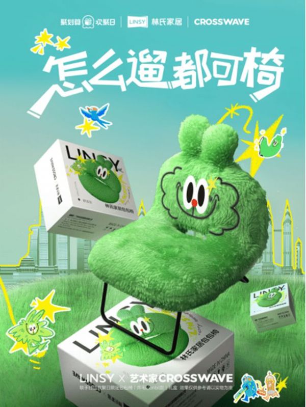 在城市营销之下,可以看到林氏家居为了撬动圈层影响力,还在产品上下了功夫,在天猫聚划算欢聚日的活动中,携手了知名潮玩艺术家CROSSWAVE,将年轻人酷爱的炸毛Lionbit IP为“包包椅”赋予潮流基因,打造了一款更具识别性、更有视觉冲击感的限定包包椅「炸毛Lionbit款」。