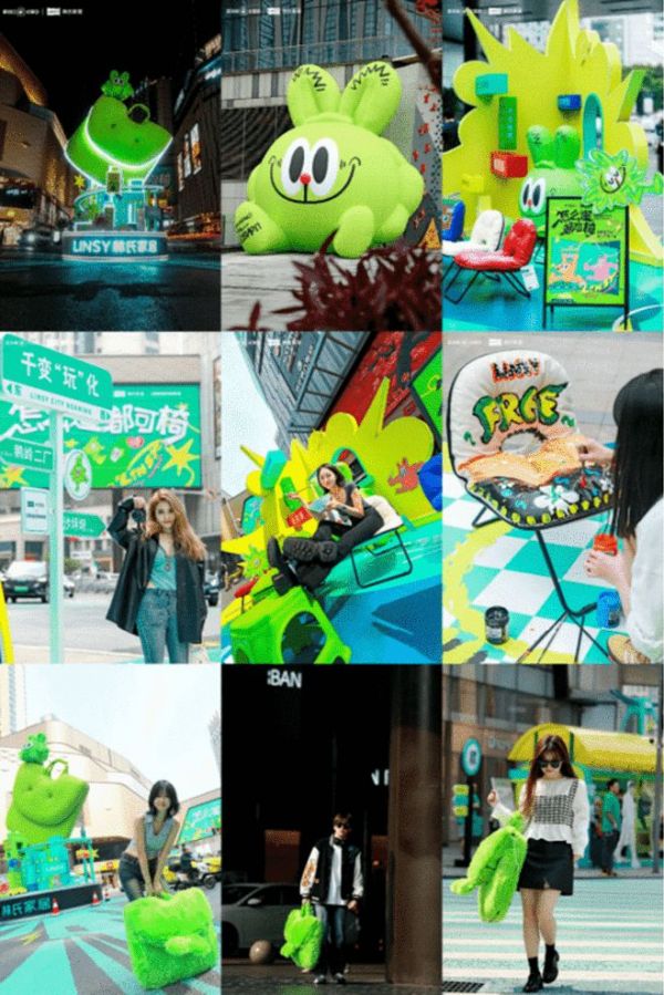 ②预演消费场景,提升消费者的价值认同感。在当下的消费环境里,消费者越来越不会因为噱头去买单,“包包椅”虽然听起来很吸引人,但如果没有切实的感受只会看个热闹,为了打消这个顾虑,可以看到林氏家居在借着“遛山城”的幌子呈现了百搭的使用场景的同时,也将“包包椅”拉倒了线下,让“怎么遛都可椅”多了一份真实感。