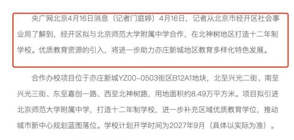 据央广网记者报道,经开区拟与北京师范大学附属中学合作,在北神树打造十二年制学校,计划开学时间为2027年9月,解决了附近一带的上学难题。