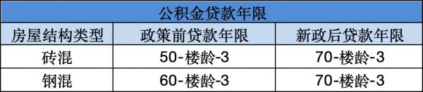对于完成老旧小区改造的住房,房屋可贷年限从低于房屋剩余使用年限减三年(砖混结构50年/钢混结构60年-房屋使用年限-3年)优化为低于剩余土地使用年限减三年。