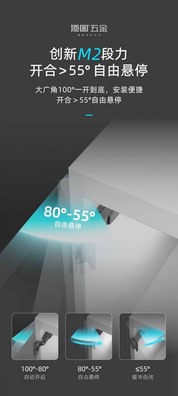 随着消费者生活品质的不断提升,传统的铰链已经不能满足消费者的需求了。顶固一字静音阻尼铰链,拥有独特的M2段力,大广角100°一开到底,安装便捷;同时在开合角度55°-80°之间可自由悬停,便捷取物;当柜门小于55°时,自动缓冲闭合,安全省心。