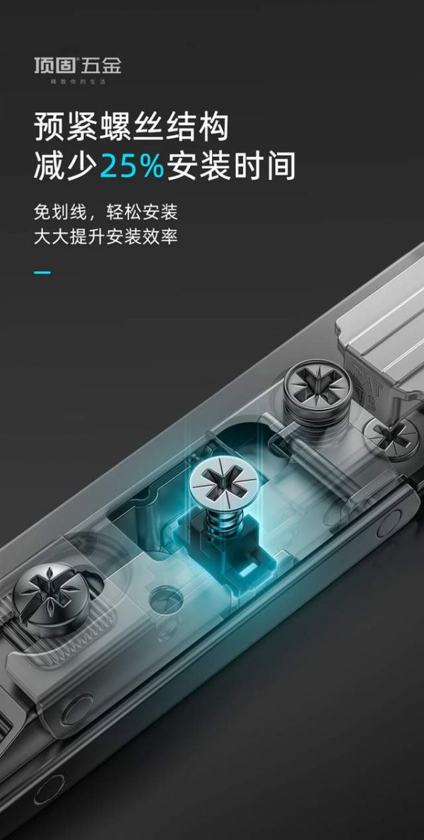 随着门墙柜一体化浪潮和市场竞争越来越激烈,效率和通用性成为了行业的关键词。与传统铰链相比,顶固一字静音阻尼铰链采用预紧螺丝结构,在安装时可以免除划线步骤,轻松快速地调节铰链位置,至少减少25%安装时间,大大提升安装效率。除此以外,顶固一字静音阻尼铰链适用于16-25mm门板,通用性更强,能满足更多的安装条件,让家居企业在设计的时候拥有更大的灵活性。