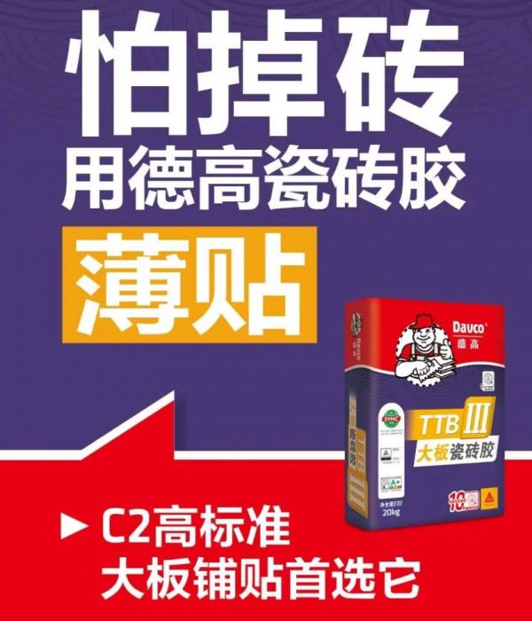 不妨试试德高TTBIII大板瓷砖胶,这款瓷砖胶达到C2级标准,在规范工艺条件下,尤其适用于室内铺贴吸水率≥0.2%,尺寸≤600×1200mm的陶瓷大板。