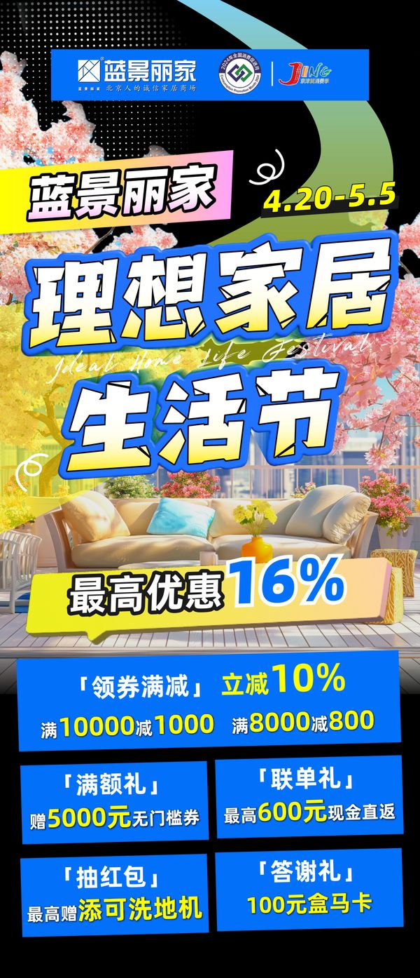 活动期间,顾客在蓝景丽家购物签订商场统一销售合同,并在商场收银台交款认证,满足条件即可扫码进群,最高领5000元现金券