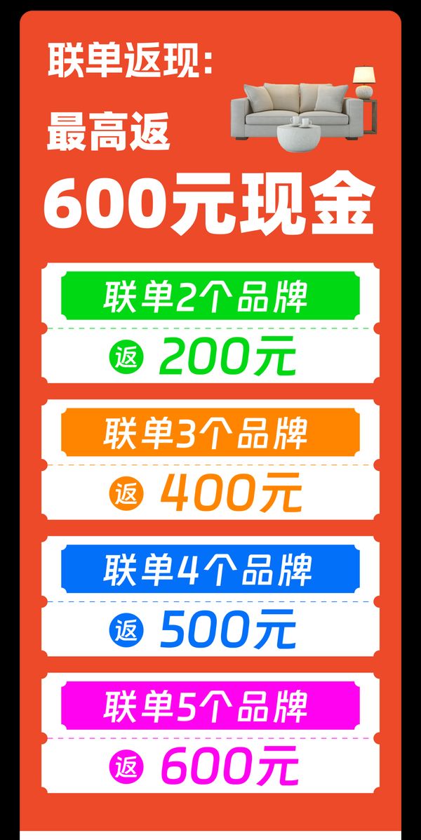 单笔合同实付金额满5000元(含),购物满2个品牌及以上,满足条件最高返600元现金