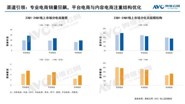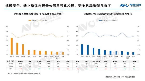奥维云网(AVC)线上监测数据显示,2024年一季度线上整体市场零售额TOP10品牌合计占比为68.1%,零售量TOP10品牌合计占比为55.6%。其中: