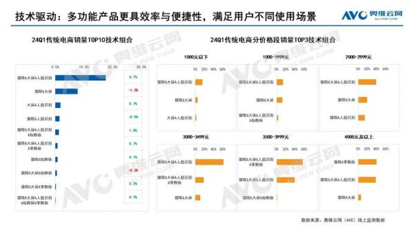 奥维云网(AVC)线上监测数据显示,2024年一季度传统电商渠道技术组合中,具备“猫眼+大屏+人脸识别”功能的产品销量排名第一,占比达到17.6%,较去年同期增长4.1个百分点。而在不同价格段的技术组合的重点不同,并随着价格段越高,技术组合产品的零售量占比越高。3000元及以上市场中,具备高端属性的指静脉、掌静脉的技术组合排名提升,如具备“猫眼+大屏+人脸识别+掌静脉”功能的产品,在3000-3499元市场中零售量占比为18.4%,在3500-3999元市场中占比达到57.1%。