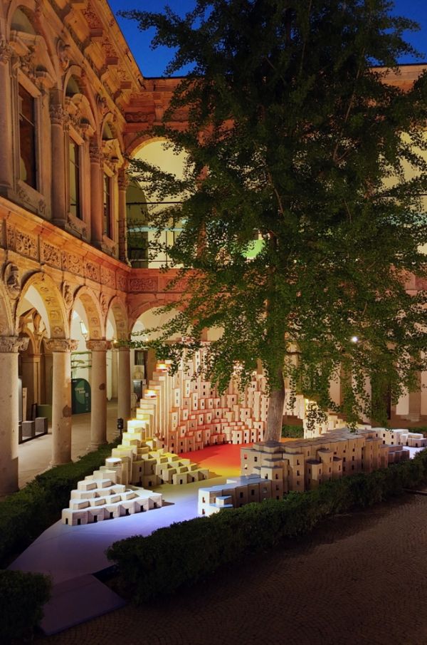 由陶瓷块元素构成的半圆形背景高达4.5米,优雅的曲线设计完美地适应了三角形的场地,与米兰大学的庭院背景完美融入。这些多功能的陶瓷块不仅仅在视觉上吸引观众,同时还能转变为休憩区,让大家可以在这个充满活力的空间里放松、社交和互动。