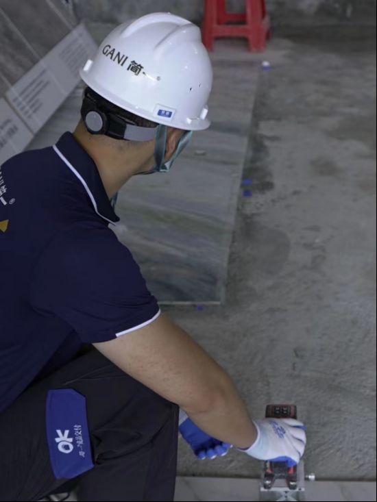 参观简一成品交付工地,从整体的施工环境上就可以看出简一的与众不同。在这里,你的第一印象就是井然有序,一眼舒服。不同于脏乱差的工地环境,简一工地所用到的材料会按照使用区域分类堆放,井井有条。这样不仅能给客户留下深刻的正面印象,凸显品牌差异,更能在无形中提升瓦工自身的工作心情,进而提高铺贴的质量和效率。这些看似跟技术水平无关的细节处理,其实也反映了瓦工师傅对工作的认真程度。