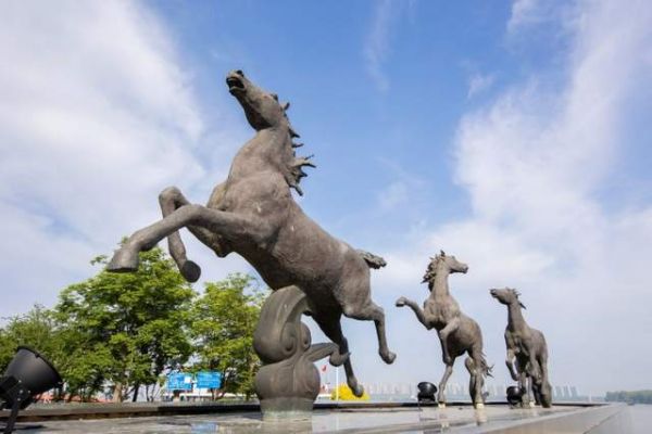 五马渡,一个传奇的渡口,位于南京燕子矶幕府山北麓的江边。一侧是静谧翠绿的幕府山,一侧是气势如虹的浩瀚长江,青山绿水间孕育出“五马浮渡江、一马化为龙”的传奇。相传西晋末年“八王之乱”后,五王渡江,而司马睿所乘坐骑化龙飞去,后创建东晋王朝,五马渡也因此而得名。广场上五马奔腾的雕塑是历史的凝固。
