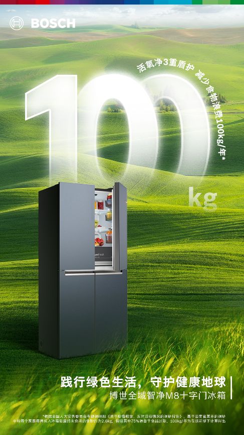 除家居除菌清洁外,博世家电也通过优化冰箱、油烟机等产品的节能性能,为消费者打造居家绿色厨房空间。博世全域智净M8十字门冰箱配备活氧净3重盾护,可产生健康活氧,强效清除包括大肠杆菌在内等病菌、病毒4,并轻松实现90%5以上清风净味,守护食材鲜储环境的全方位健康纯净;更可有效延长食材保鲜时长3倍,每年可减少100kg食物浪费,从而减少居家食物消费的碳排放及碳足迹6。