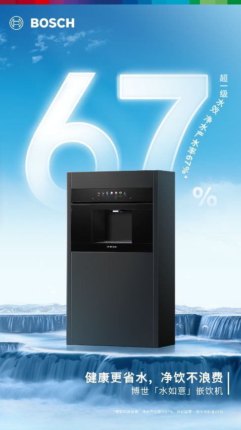 值得一提的是,博世家电关注到居家饮水过程中存在的污染问题,例如因多次买换水而产生水瓶的白色污染问题。博世「水如意」嵌饮机凭借全自动上下水功能回应了这一痛点,无需换水即可畅饮好水。假设一家三口每天的饮水量为10L,按照一瓶矿泉水500ml容量计算,使用博世「水如意」嵌饮机则可以减少20瓶矿泉水瓶的塑料污染,告别白色污染。此外,产品搭配过流式UV抑菌模块及食品级材质水路,能有效净水,净水产水率达67%8,超国家一级水效。
