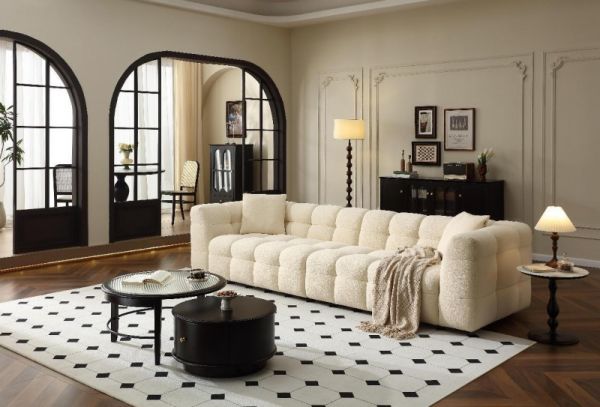 方块棉花糖造型搭配奶霜白配色,圆润蓬松,治愈感拉满;仿羊羔绒面料,绒粒丰富,柔弹耐磨,不易起皱起球;座包、靠包采用恒压高弹海绵填充,柔软Q弹,支撑厚实有力,坐感软而不塌;360°立体拉点设计,凹凸有致,挺括丰盈,丰富坐感体验;71cm加宽座深,坐卧躺不局促,追剧小憩自由随心。