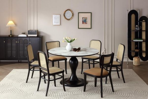 1.2m主流小巧圆桌,4~6人轻松落座,复古优雅,小家也能搭配出精致感;肤感钢化玻璃台面,哑光质感石纹,高雅大气,触感细腻,耐污易清洁;优雅裙摆底座,灵动曲线尽显曼妙,如精心雕琢的上世纪艺术品,视觉更轻盈;加大圆盘实木底座,有力承托,安稳陪伴每一餐。