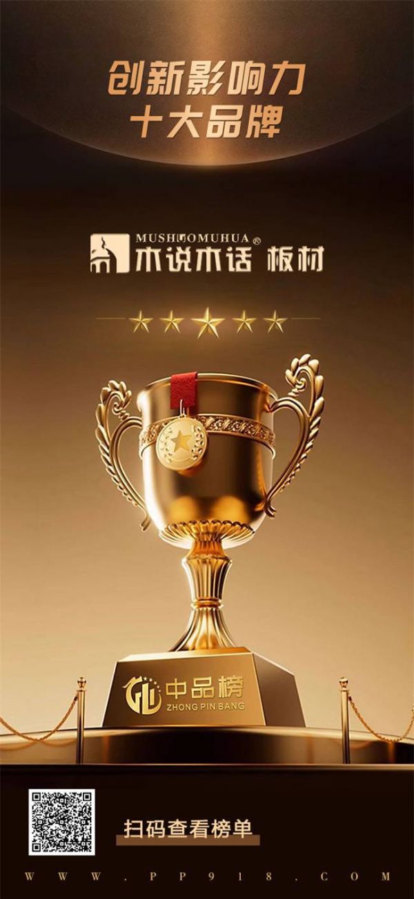 深耕木业行业十余载,木说木话板材始终秉承着以“板无醛 才健康”的核心理念,用心雕琢着每一处艺术空间,致力于为消费者打造一个健康、舒适、自然家居环境。凭借着多年的匠心坚守、领先的创造力及市场影响力,继2023年上榜中品榜后,于近日再次登榜中品榜2024年创新影响力十大品牌荣誉榜单,再次展现了其强大的品牌实力。