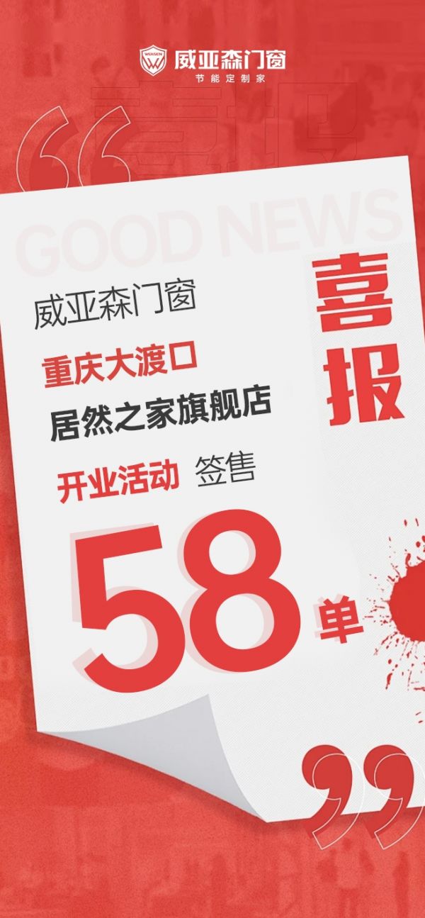 威亚森门窗重庆大渡口居然之家旗舰店全体同事上下一心,从预营业开始,截止到4月14日开业活动爆破,共签58单,获得骄人业绩!