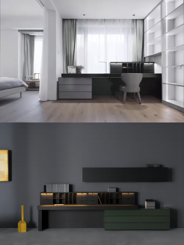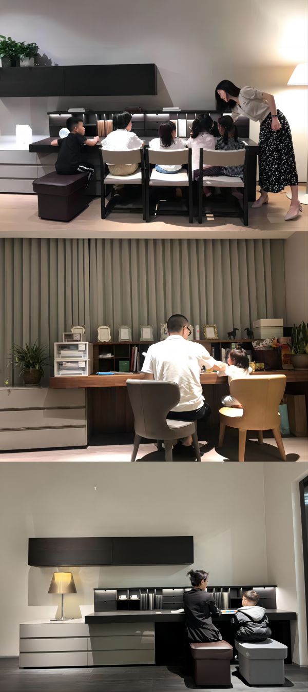 2.72米的超长桌面,不仅仅是一块桌面,更是温馨的家庭场景的延展:在这个“宽敞”的空间里,我们可以和爱人一起探讨、处理手头没完成的工作,或是闲暇时一起坐下来看书聊天,甚至是一起联机打盘游戏,放松一下;如果家里有孩子,我们可以轻松地坐在孩子旁边,陪他做手工、做作业,桌旁的书架与抽屉不仅仅是储物空间,更是培养孩子自理能力的起点,让孩子从小就学会整理和收纳,养成良好的生活习惯……双人乃至多人并排的使用功能,让陪伴变得平等、交织,又有互不打扰的尊重与宁静。这个被戏称为“二胎书桌”的家具,不仅提供了功能性的使用体验,更承载了家庭成员之间的深厚情感与共同成长的美好愿景。