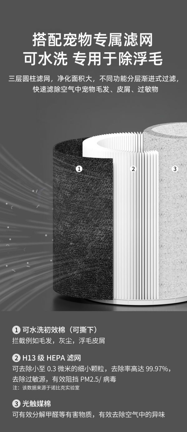 在这方面,诺比克KJ360宠物空气净化器是三层圆柱滤网,净化面积大,不同功能分层渐进式过滤:可水洗初效棉(可撕下),拦截毛发、灰尘、浮毛皮屑;H13 级 HEPA 滤网,可去除小至 0.3微米的细小颗粒,去除率高达 99.97%,去除过敏源,有效阻挡 PM2.5/病毒;光触媒棉则可有效分解甲醛等有害物质,有效去除空气中的异味。