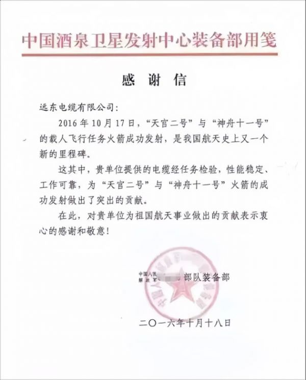 记者了解到,八年前远东电缆收到过一封来自酒泉卫星发射中心的感谢信,记录了“紧急时刻”下远东电缆与中国航天的链接。2016年9月16日晚近12时,“神舟十一号”发射工作已经进入调试阶段,远东电缆突然接到来自酒泉卫星发射中心的电话,中心表示希望公司能在三天内,赶制一批航空用高端电缆产品并送至酒泉,助力航天基地建设及“神州十一号”发射。“公司接到任务快速反应,全力赶工,最终用72小时的“火箭速度”不辱使命交上满意答卷。”远东电缆相关负责人表示。