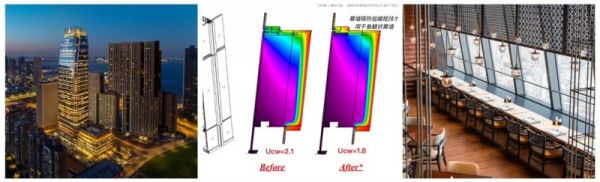 奢华酒店在新设计新技术加持下同样也可以达成低碳节能设计标准,为应对项目独特的鱼鳞片状外幕墙外形设计而带来的苛刻节能,抗结露,低碳以及高室内热舒适度的设计挑战,设计团队再次采用暖框幕墙隔热毯等高新技术和设计,以确保酒店建筑无冷热桥的隔热连续性高效设计和抗结露设计, 大幅提升了建筑外墙的节能性能和室内舒适度,让建筑无论外观设计自由度和各项低碳节能指标性能均处达到国内领先水平,同时为酒店住客提供了舒适典雅的居住环境。