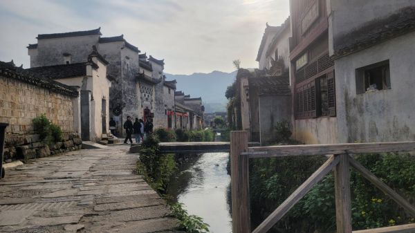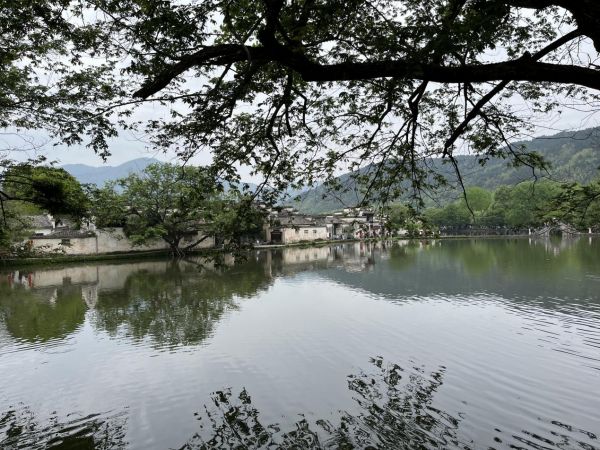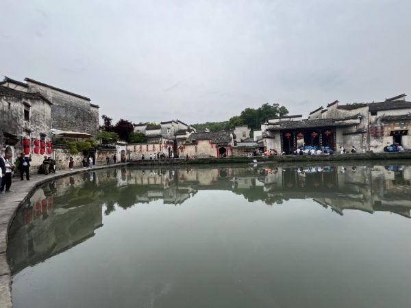 On the morning of April 25th, a new day of the study tour began. With whitewashed walls and black tiles neatly arranged, looking up, the eaves and a wisp of cloud sketched a picture of ink wash painting against the sky. The designers wandered through the alleys of Hongcun, experiencing the beauty of Hui-style architecture. Amidst the misty rain, Hongcun exuded poetic charm. As the saying goes, "Rippling streams like belts, every household has clear springs," the layout of Hongcun is based on the landscape, with water connecting each household. Clear springs flow past the courtyard gates, blending sky and water, with the orderly reflections of the surrounding homes in the water creating an intoxicating beauty. Design stems from life and nature, and studying in Hongcun aims to let designers experience Hui culture, integrate it into their designs, and promote it nationwide.