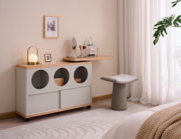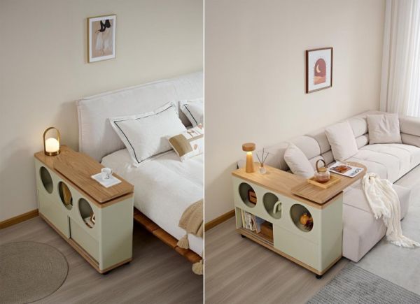 多功能床边柜,3个圆形镂空格+滑门封闭柜+宽敞台面,多元储物空间,搞定收纳难题。半椭圆台面,自然延长置物空间,柔和美观;0°-180°可旋转,重叠收起、垂直拼接,解锁更多使用场景。万向滑轮底脚,耐磨耐用,推拉便捷,移动不损地板,自带刹车功能,停放更稳定。