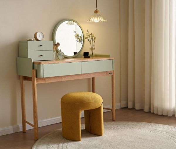 浅色红橡木纹碰撞春辰绿,自然契合,仿佛置身春日森林。40.5cm宽敞台面,物品放置不拥挤,拿取更便捷。台面半围合造型,贴心加高,有效防止物品滑落,置物更安心。台上双抽百宝箱,收纳首饰配件,台下宽大双抽,容纳更多杂物。双H型实木底架,视觉轻盈,支撑有力。