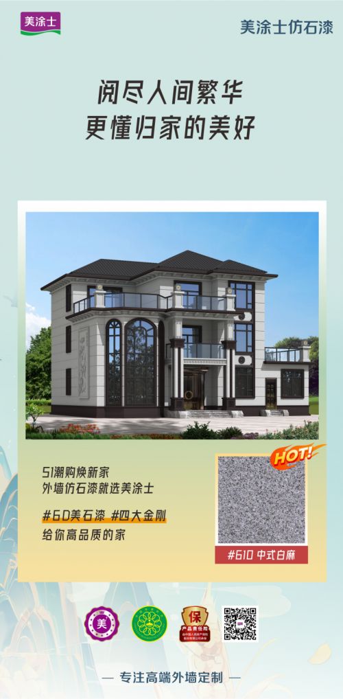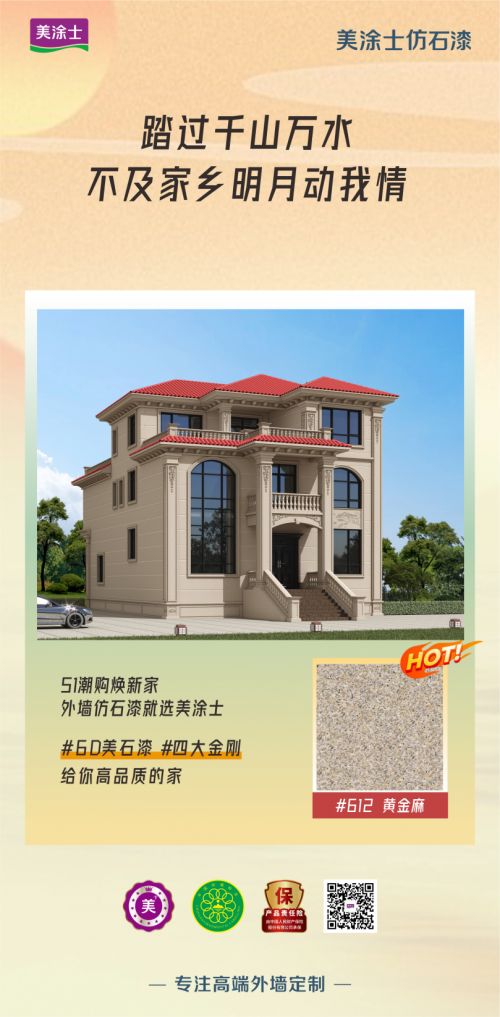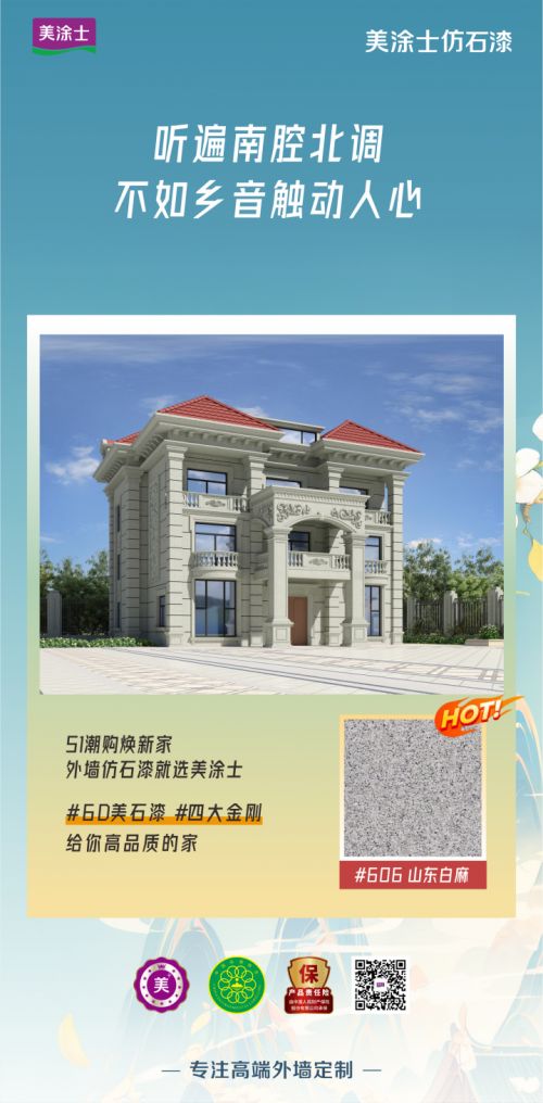 作为美涂士仿石漆当之无愧的明星爆品,6D美石漆「四大金刚」宝藏色,以其高颜值的出「色」表现,赋予现代别墅独具韵味的设计美感与宏伟气质,自上市以来,深受市场消费者的热捧与喜爱!