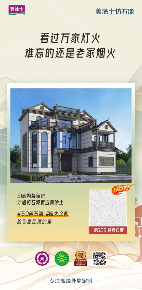629经典白麻是徽派别墅的代表性颜色之一,它是一眼望去就知属于中国的美,以灰白交织的淡雅色调,将浓厚的国风意蕴书写在其中,让现代中式别墅呈现一种端庄、雅致的东方韵味。