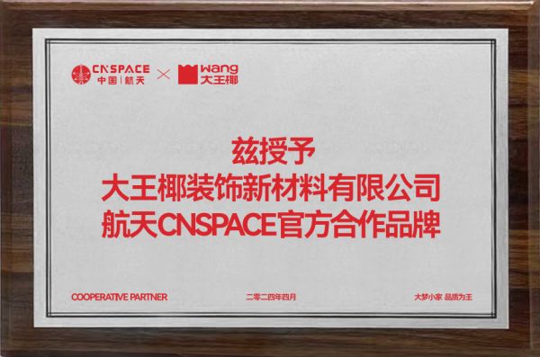 在新时代的浪潮下,大王椰坚持匠心为本,坚守健康品质生活的美好家园梦,以敢于超越、永续探索的“航天精神”刷新品牌形象和价值内涵。2024年4月,大王椰与中国航天CNSPACE达成正式合作,并发布联名产品——大王椰柜门板,致敬自主创新、奋力攻关的航天精神,也是向更高品质产品的不断探索。
