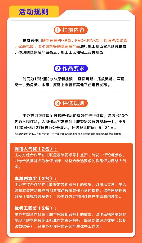 主办方组织评审团对参赛作品的有效性进行评审,筛选出20个优秀入围作品,入围作品将发布到【联塑家装官方视频号】,于5月20日-5月27日进行公开展示,评选截止时间:5月31日。