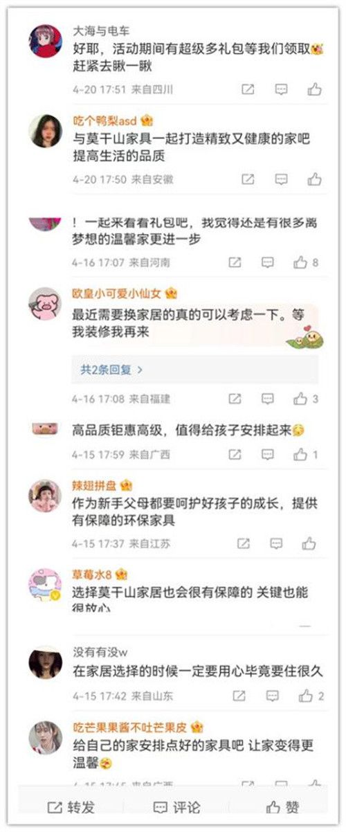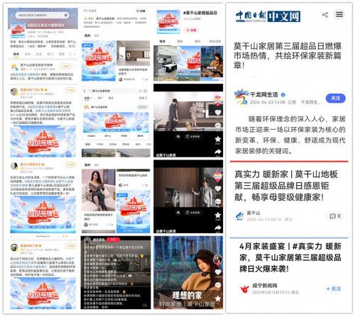 全网主流媒体引领宣发造势,莫干山家居超品日活动声量一路攀升,微博、小红书话题#真实力 暖新家持续发酵,引发亿万网友的共鸣与参与,共同夯实莫干山家居的环保家居品牌形象!抖音创意短视频大放异彩,更有家居/生活/母婴类达人助阵宣发,为活动注入了源源不断的活力,将环保家居的理念与宗旨传递给每一个热爱生活的消费者!
