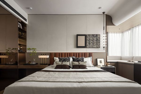 主卧浅灰底色更显温馨,配备独立卫浴、超大飘窗,私享小家化的体验打造现代人居新范本,以适配塔尖人士的尊崇身份。床头软包采用竖条格栅软包,搭配木饰面背景墙、金属线装饰,线条简约,让空间更具层次感。通过不同材料的有机结合,兼顾视觉感受和物理功能。