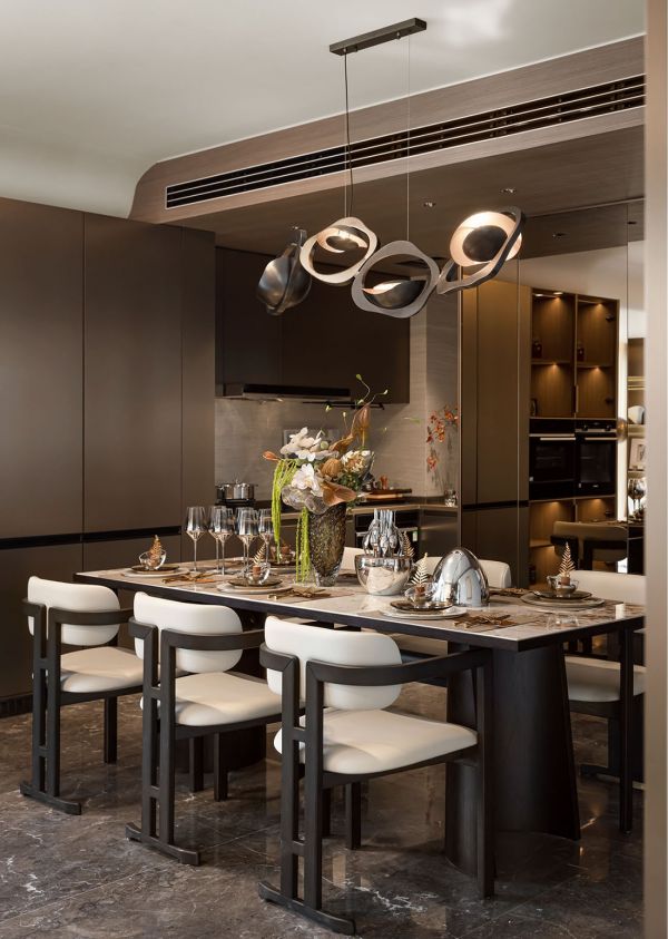 餐厅吊灯梦幻的流线下,古典形制器物被安放在餐桌一侧,模糊了世纪更替的时间界限。不去刻意雕琢种种物品的秩序,自然承接生活产生的情绪。