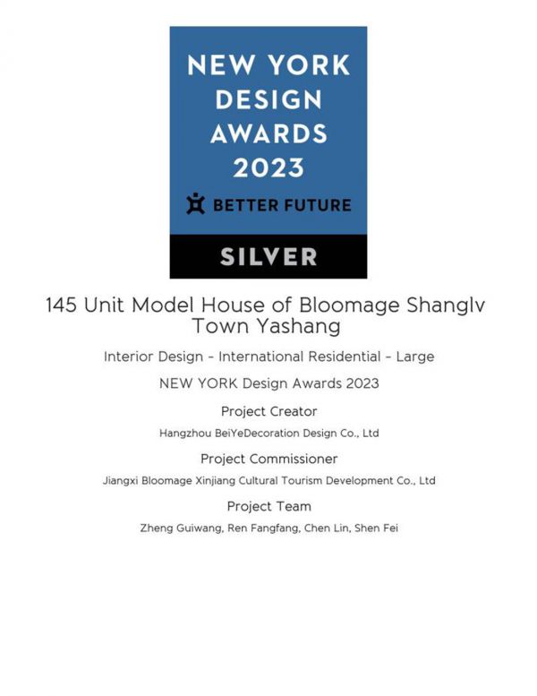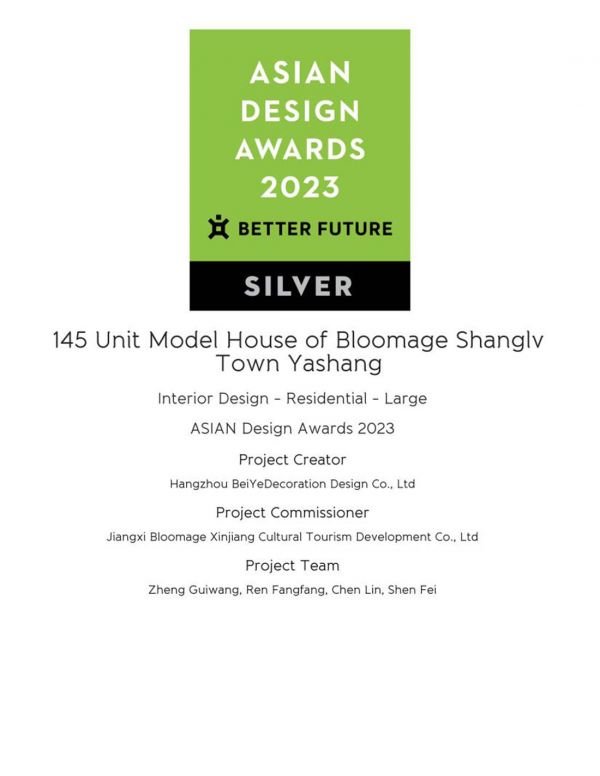 Asian Design Awards 亚洲设计奖是面向全球设计师的国际设计大奖,由BETTER FUTURE主办,旨在表彰具有无限创意的设计作品。华熙·雅尚145平样板间项目荣获类别银奖。