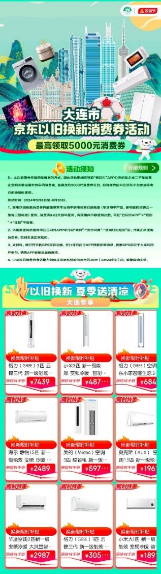 对此,京东从5月8日起推出了大连家电家居以旧换新补贴专场。已领到消费券礼包的大连消费者,在京东APP搜索“大连以旧换新”进入活动会场,选择符合一二级能效、水效标准的电视、空调、冰箱、洗衣机等家电产品,即可使用线上家电以旧换新消费券。同时,京东还携手家电家居主流品牌,推出以旧换新补贴福利,并聚焦空调、扫地机、咖啡机等大小家电,推出旧机价格提升计划。以空调为例,挂机旧机价格提升至250元、柜机旧机价格提升至450元。这意味着,大连消费者在京东家电家居以旧换新补贴专场购买一台格力2匹京韵壁挂式空调,可享受京东联合品牌给予的100元以旧换新补贴、250元旧机价格,同时开启手机定位通过云闪付支付即可使用大连2500元以旧换新消费券,三重优惠叠加,总计可立省2850元。值得一提的是,如果大连家电以旧换新消费券的补贴金额超出新机购机款,消费者不但可以实现0元购,而且剩余的金额还可以通过云闪付在京东以旧换新其它家电产品,直到花完为止。