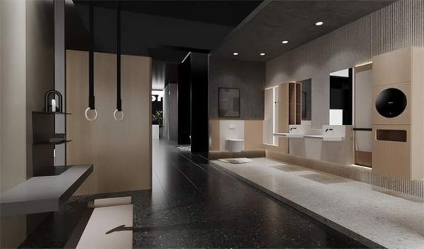 在整体布局中,通过LDKB一体化的设计原理,欧路莎卫浴将深色系的空间设计与极简的几何元素大胆运用,既塑造了展馆的整体调性,也营造了一种高级而神秘的艺术氛围。