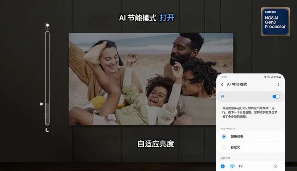 AI节能模式通过传感器分析环境光线,然后自动调节AI电视屏幕亮度,从而节约能源。同样,电视的芯片可以识别屏幕中的动态并改变屏幕亮度。代表着向可持续发展迈出了一大步。