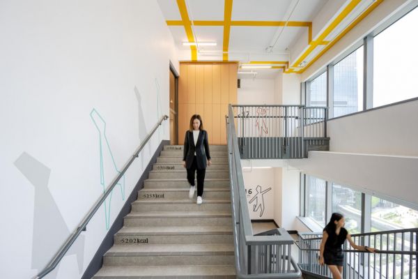 香港税务中心的设计融合多种环保元素,不仅实现高效办公协作,更使碳排放减少三成 。 室内布局注重员工身心健康,引入充足自然光及鲜风,并加入节能省水等环保设计。大楼 内每层皆设有半户外休憩露台,让用户能随时享受绿色景致。 “健康步梯”鼓励用户利用闲 余时间锻炼身体。