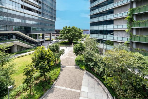 大楼设计延续社区“绿脉"元素,保留原生大树,绿化率超过 30%。清风习习的绿色广场全天 候开放给公众使用。
