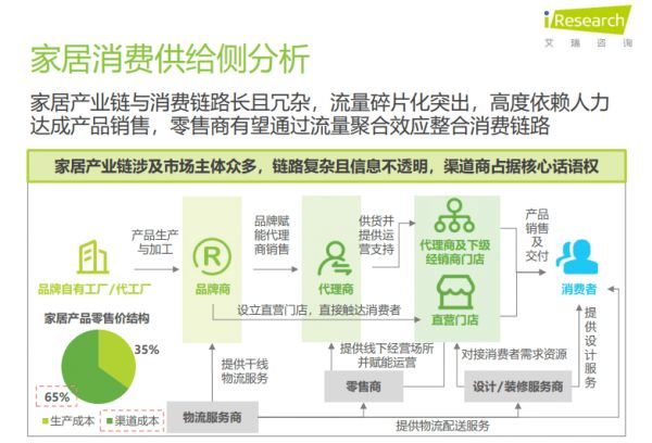 基于终端消费需求变迁,家居市场展现出强劲的发展韧性,供给端的创新同样需要因势而变。报告围绕家居消费供给侧分析到,家居产业链与消费链路冗长且繁杂,流量碎片化十分突出。此时,离消费者更近、更具备借流量聚合能力赋能全产业链条的渠道商便占领了核心话语权。