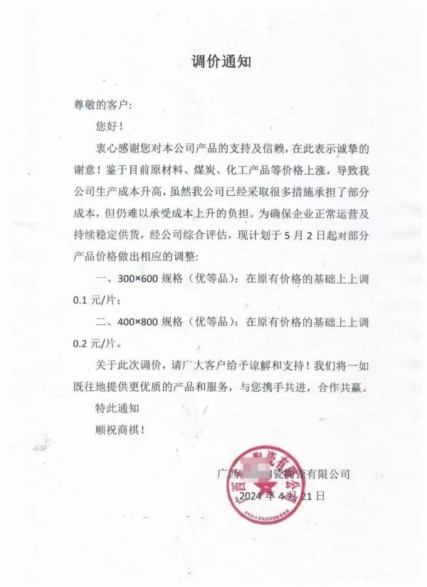 另外还有2家广西陶企发通知,分别对300×600规格、400×800规格进行涨价,涨价幅度分别为:0.1元/片、0.2元/片左右。