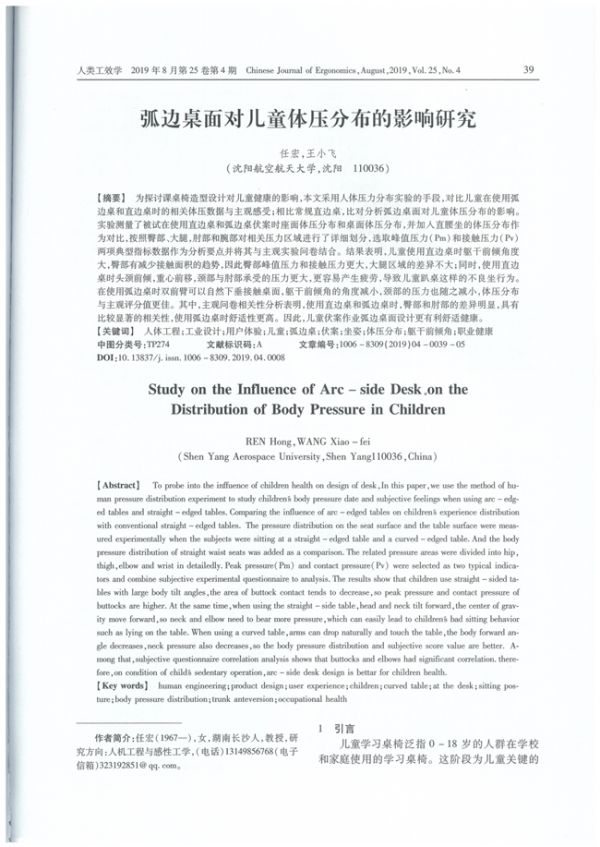 在人类工效学杂志上,沈阳航空航天大学刊登了《弧边桌面对儿童体压分布的影响研究》的论文,深度论述了直、弧边桌对孩子的影响。实验研究结果显示,在使用弧边桌进行伏案作业,臀部和肘部承受的压力更小。其主要原因是在使用弧边桌时,躯干进入弧口,双前臂垂直落下时即可接触桌面,身体前倾的角度更小,因此身体重心前移的量和脊柱承受的压力更小,疲劳度降低,减少了儿童趴桌行为的概率,降低脊柱变形、驼背、耸肩等不良影响发生的可能性。